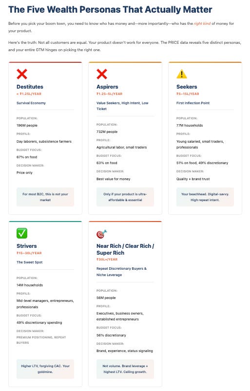 I was on a call last month with a founder from Indore. Smart guy. Great product. Just raised $300K. His Bangalore-based investors told him: “Launch in Bangalore, Delhi, Mumbai, Pune, and Hyderabad. That’s where the customers are.” So that’s what he did. And it was unclear which category of household was he going after?